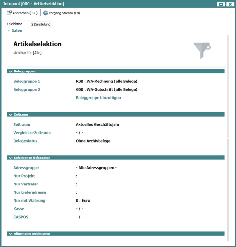 Die Daten können in der Statistikanalyse ausgewertet werden und es stehen verschiedene Gruppierungsmöglichkeiten zur Verfügung, sowohl je Zeitraum als auch frei definierbar (z. B. nach Warengruppen). Es können auch mehrere Gruppierungen kombiniert werden, z. B. nach Vertretern und Warengruppen.
