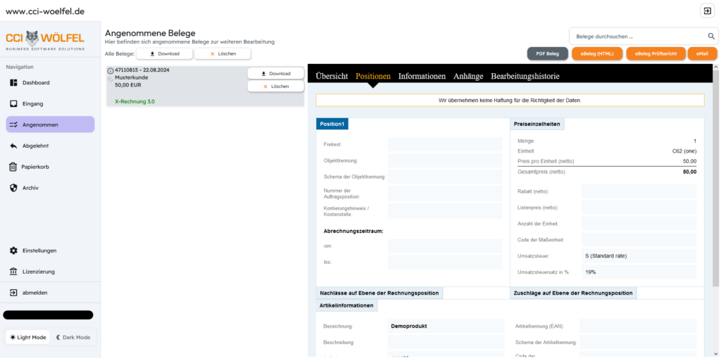 Hier können Sie eRechnungen (ZUGFeRD und X-Rechnung gemäß EN16931) sowie sonstige Rechnungen (PDF, Scan) empfangen, validieren, visualisieren, prüfen, freigeben, bearbeiten und archivieren.